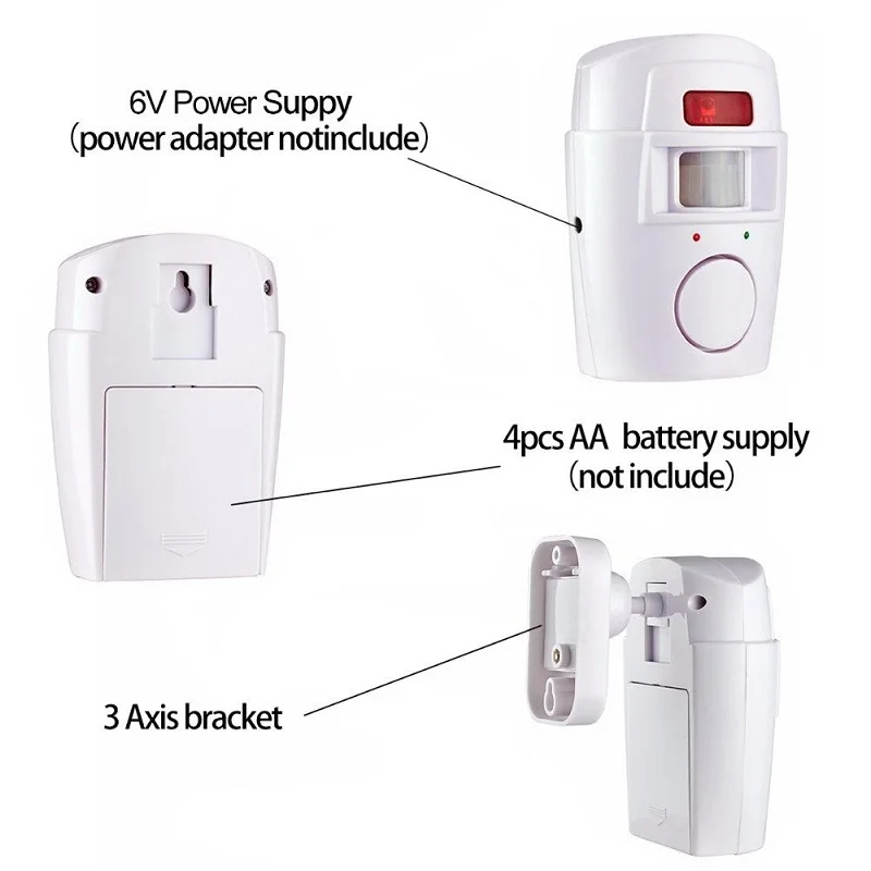 Прибор состоит их двух связанных по радио частей: передающее – это непосредственно инфракрасный датчик движения, который регистрирует активность, а приемное – устройство со встроенным динамиком, которое отвечает за воспроизведение звука. Датчик движения можно установить над дверью, а приемное устройство в комнате или кабинете поможет охватить большую территорию. В устройство можно добавить пульт управления и дополнительные извещатели.
