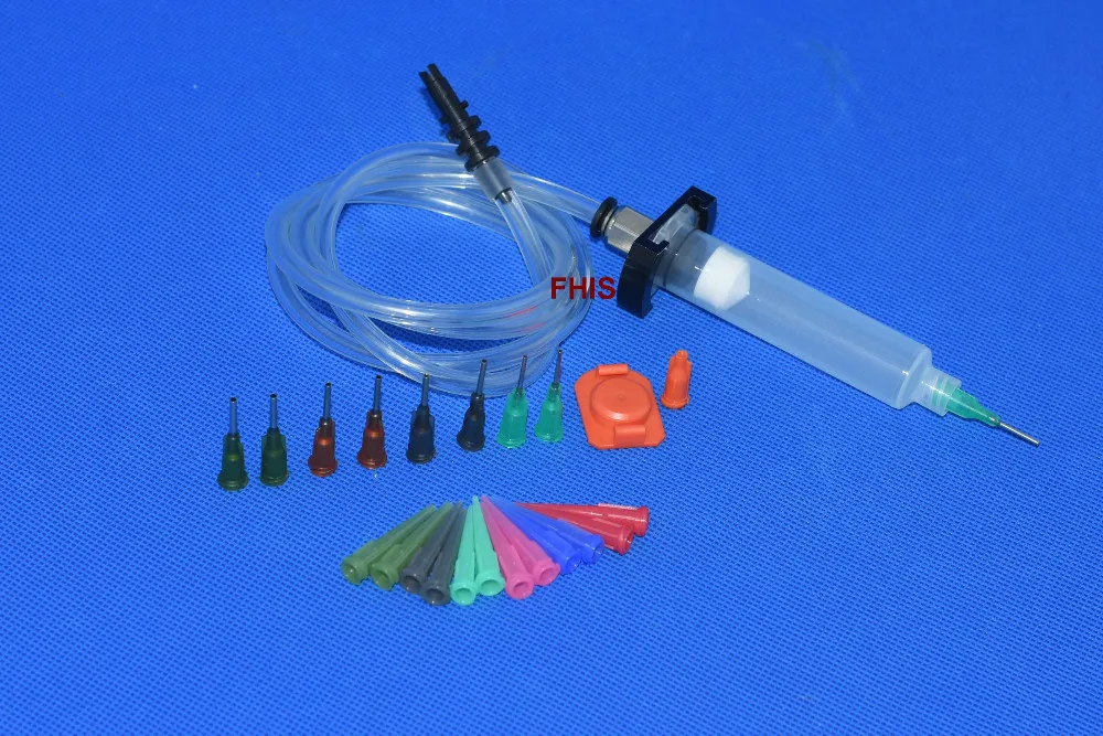 Аналогово-цифровой диспенсер двойного калибра в комплекте со стартовым комплектом дозирующих принадлежностей: шприцы 30сс/мл, переходная головка, подходящая для пневматических шприцев 30сс и 55сс, ножная педаль, выбор игл, наконечников и подставки, а также пальцевый переключатель , который просто оборачивается вокруг шприца с помощью надежного ремня на липучке, обеспечивая контроль кончиком пальца.