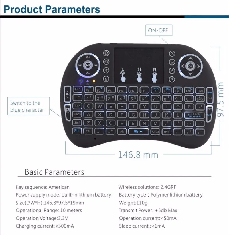 Клавиатура mini i8 — беспроводной манипулятор , объединивший в себе два устройства в одном. Т.е. i8 может работать не только как клавиатура, но и позволяет управлять курсором мыши с помощью встроенного тачпада. Преимуществом keyboard i8 является является наличие англо-русской раскладки, а также встроенная подсветка трех цветов(красный, зеленый, синий), которая позволяет использовать клавиатуру без освещения в темное время суток.