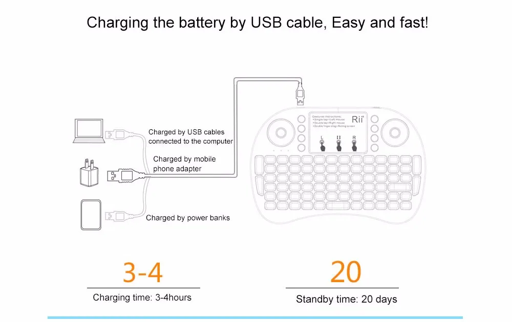 Чаще всего используется для работы с планшетами, смартфонами, игровыми приставками или ТВ-приставками на основе ОС Android . Питается универсальная клавиатура i8 от литий-ионного аккумулятора. Зарядка клавиатуры происходит через USB порт. Манипулятор работает по технологии Plug and Play, т.е. при подключении его к устройству не требует установки драйверов.