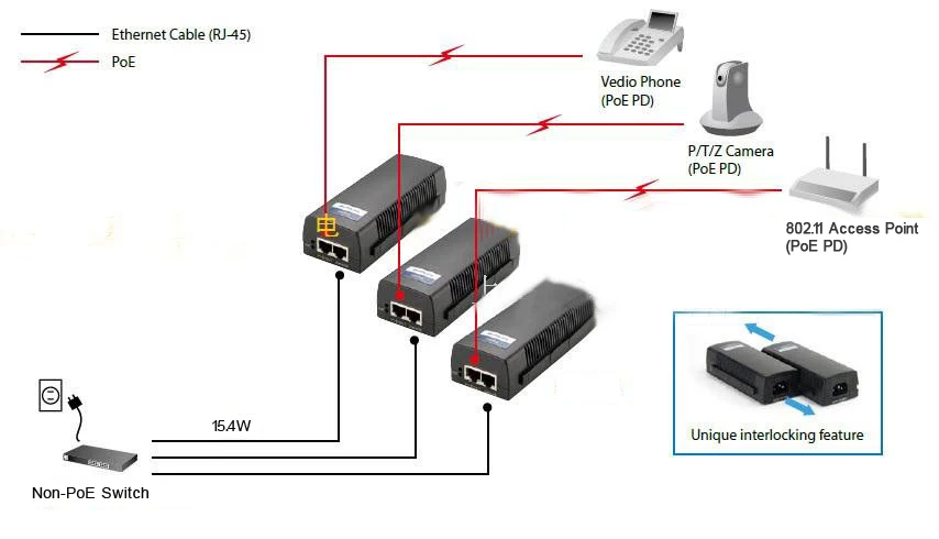 Теперь чередование кабеля Ethernet для подключения каждого периферийного устройства к центральной системе само по себе является утомительной задачей, поэтому для этого используются инжектор PoE и сплиттер PoE.