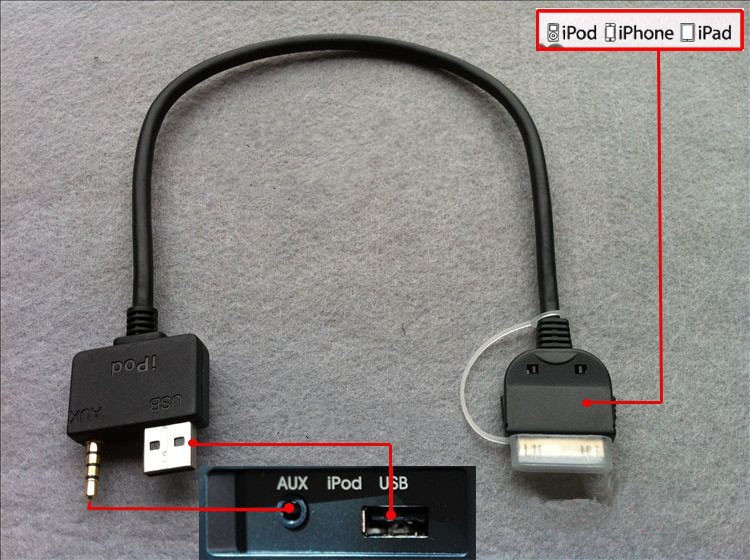 Устройство, позволяющее iPod работать через автомобильную аудиосистему. Дополнительный разъем автомобиля позволяет подключать iPod и другие мобильные устройства к автомобильной стереосистеме через разъем для гарнитуры (аналоговый выход). Тем не менее, лучший тип адаптера делает iPod (или iPhone, или iPad) частью автомобильной развлекательной системы, подключая его непосредственно к 30-контактному порту или порту Lightning устройства. Кнопки на приборной панели и рулевом колесе затем используются для управления, а данные песни можно просматривать на встроенном экране автомобиля. См. док-станцию Apple, разъем Lightning и автомобильный адаптер MP3.