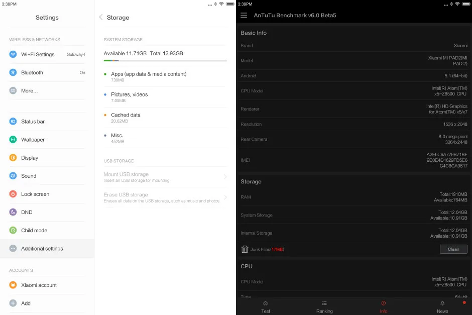 Как мы уже упоминали, Mi Pad 2 установлен четырёхядерный SoC от Intel — Atom x5-Z8500. Процессор выполнен по 14-нм техпроцессу и относится к микроархитектуре Cherry-Trail. Максимальная частота ядер составляет 2,24 ГГц. Встроенная графика HD Graphics функционирует с частотой вплоть до 600 МГц. Объем оперативной памяти ограничен двумя гигабайтами.